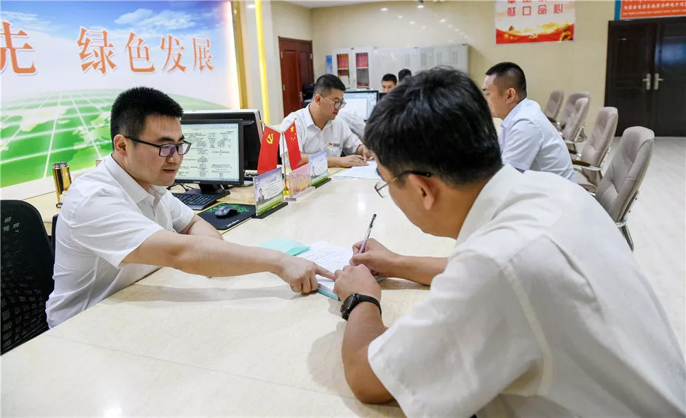 2019年7月16日,在内蒙古自治区自然资源厅的自然资源政务大厅内,办事员(左)为采矿企业办理相关审批手续。新华社记者 彭源 摄