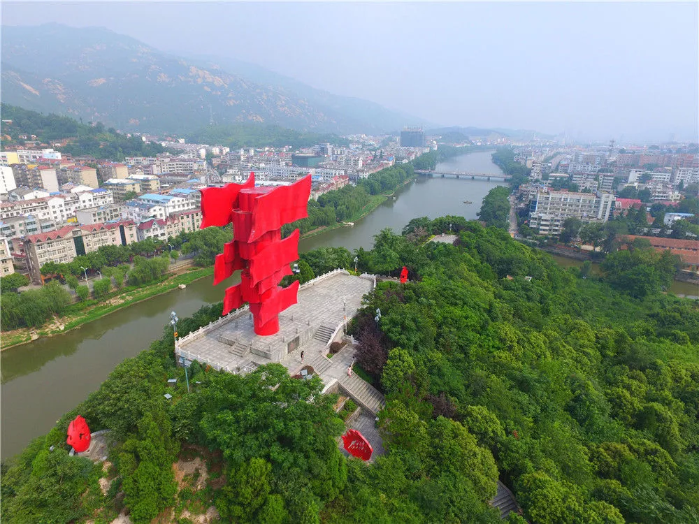 这是河南省信阳市新县鄂豫皖苏区首府革命博物馆附近的英雄山八面红旗雕塑(2017年8月4日无人机照片)。新华社记者 冯大鹏 摄